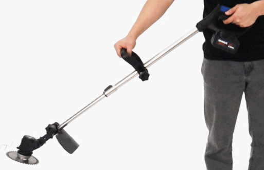 어깨에 메는 견착식 충전 예초기로, 한 손으로도 작업이 가능할 만큼 가볍고 중심이 잘 잡히는 제품입니다.