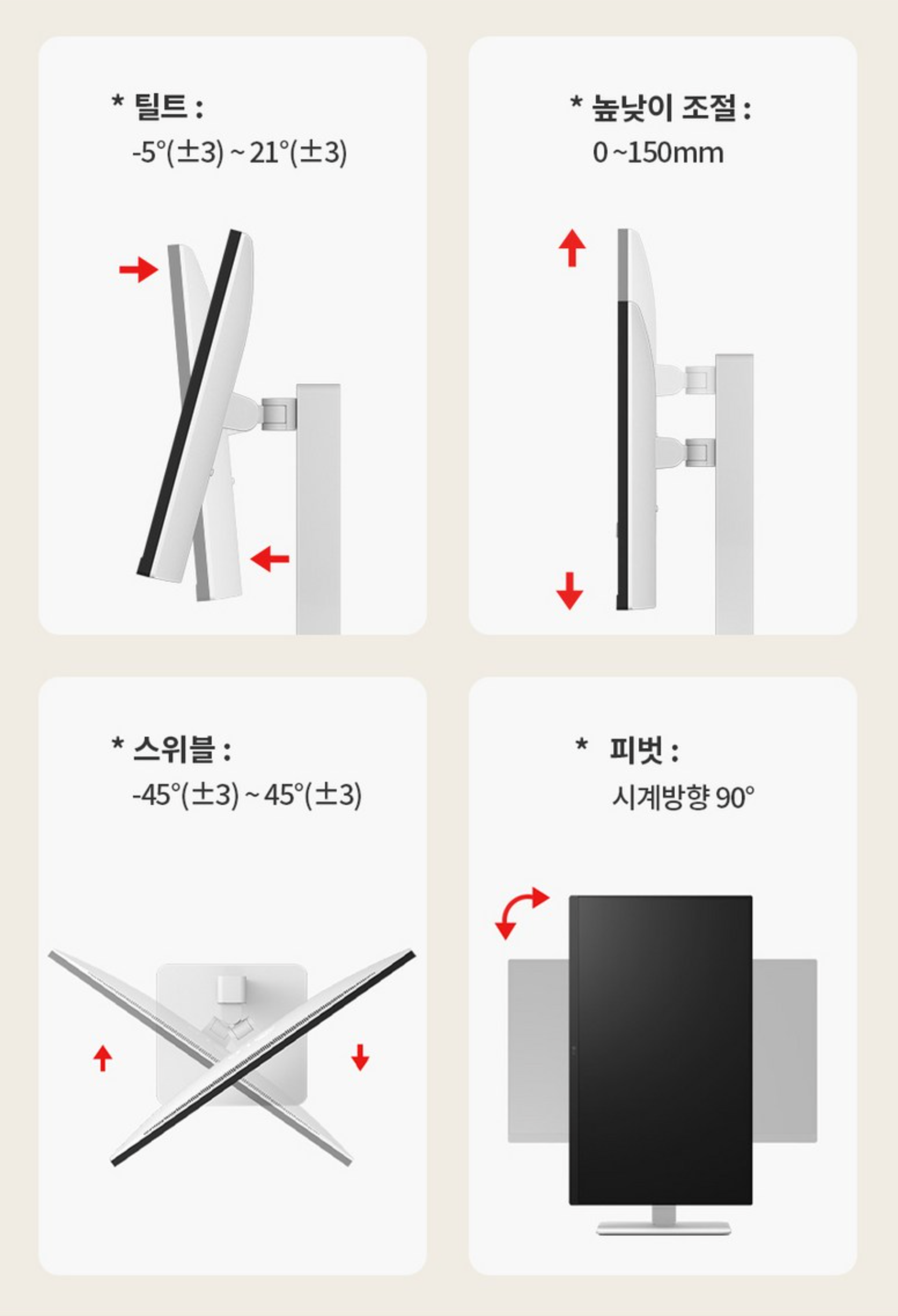 - LG: 높낮이 조절 + 피벗 가능하지만 외장 어댑터 크기 큼